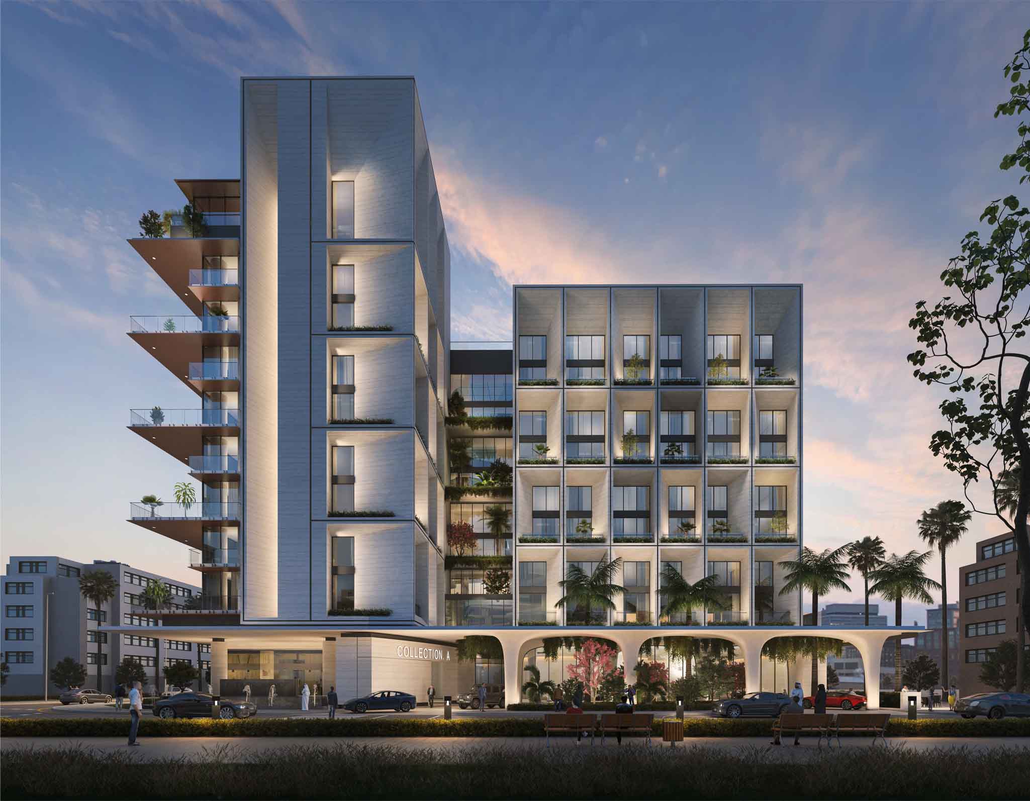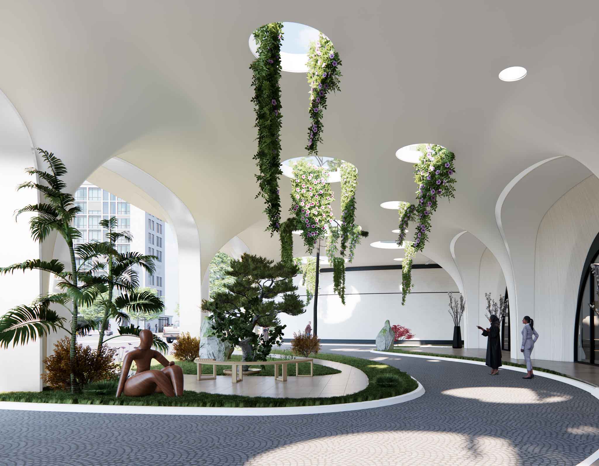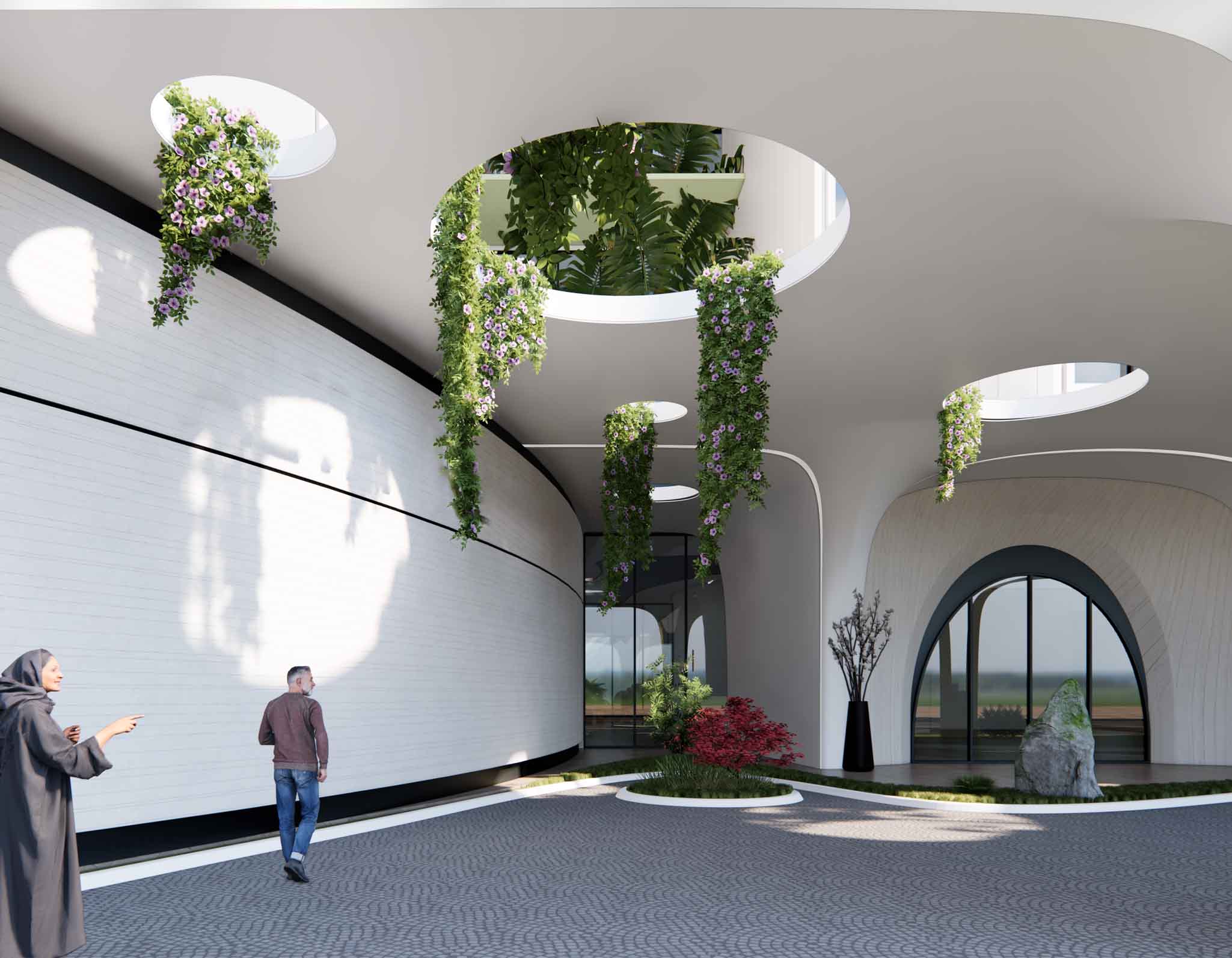 The 8-storey mixed-use building in Satwa, Dubai, features a glass and textured stone façade integrated with trees and planters. At its core, a "green-lung" atrium serves as the design's main element, bringing natural light deep into each floor and acting as a vertical garden. The building promotes strong connections to nature with green spaces, including a rooftop garden and planters integrated into the canopy at the drop-off area. This biophilic design enhances air circulation and creates a breathable, harmonious environment, connecting spaces through materiality, spirituality, and visual appeal.