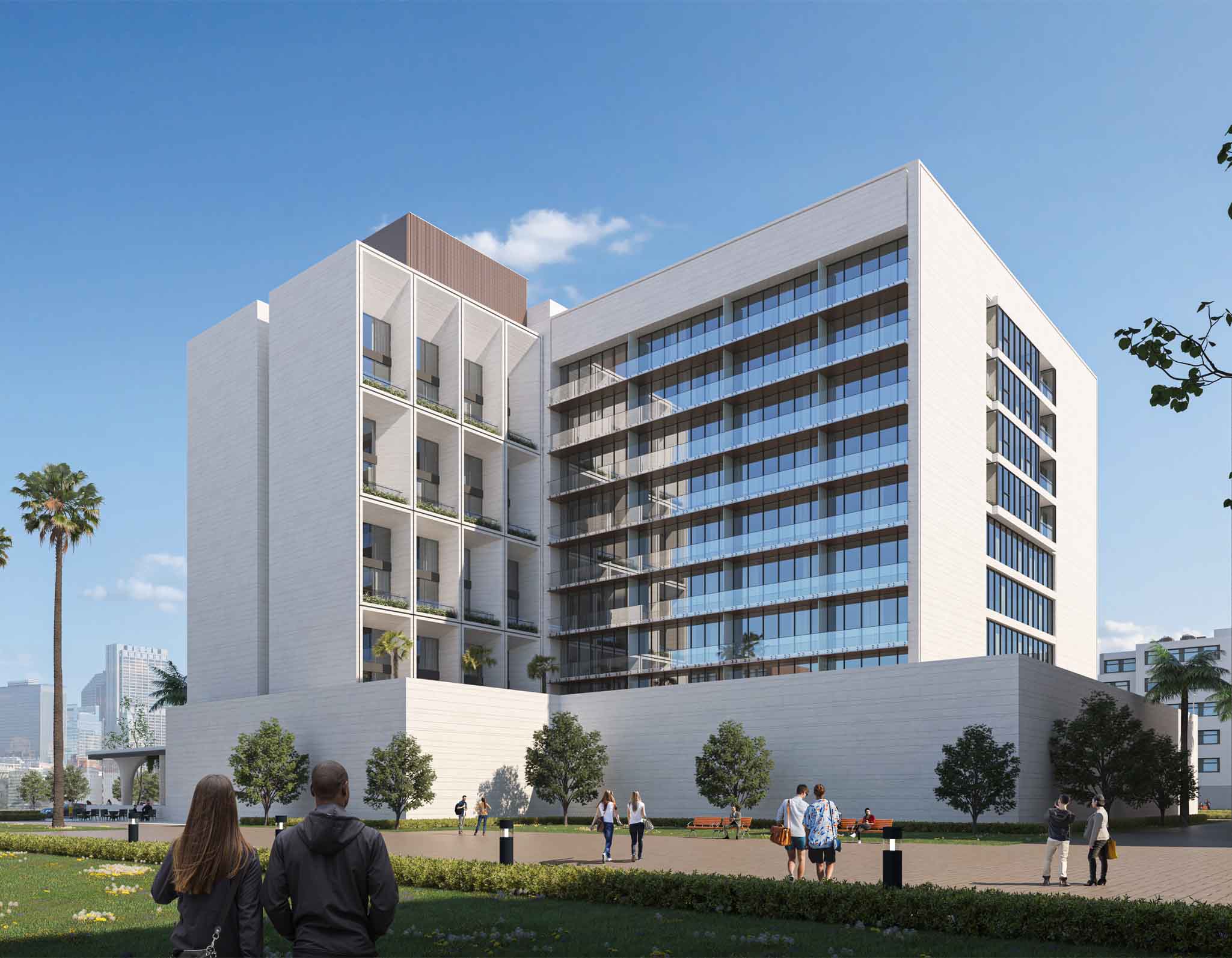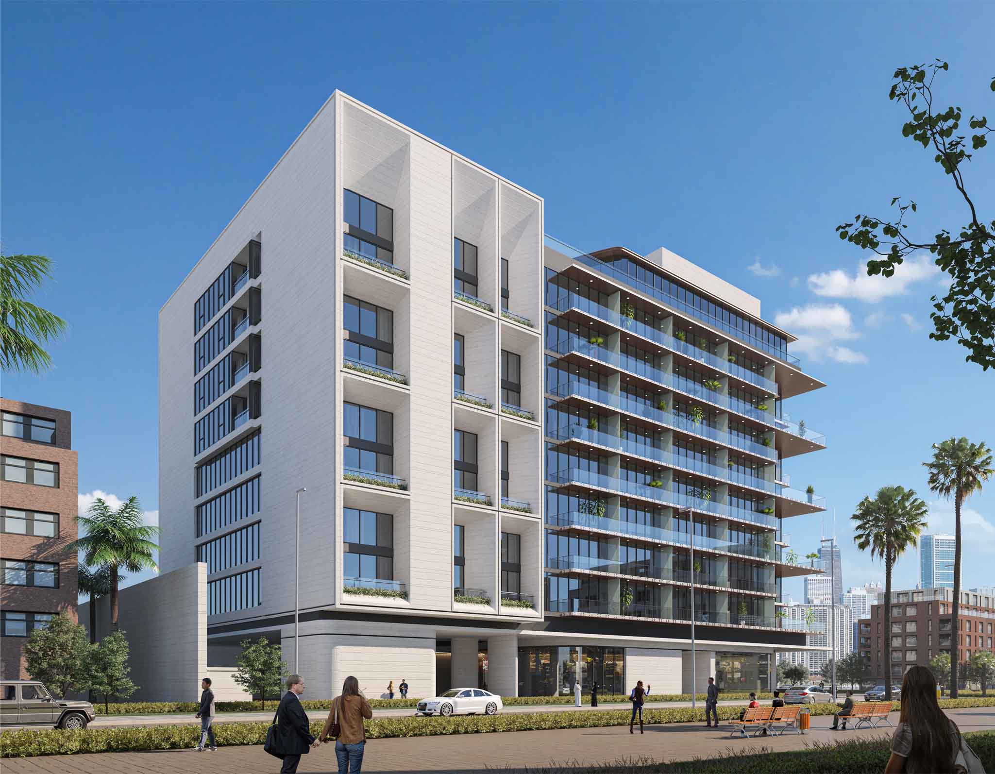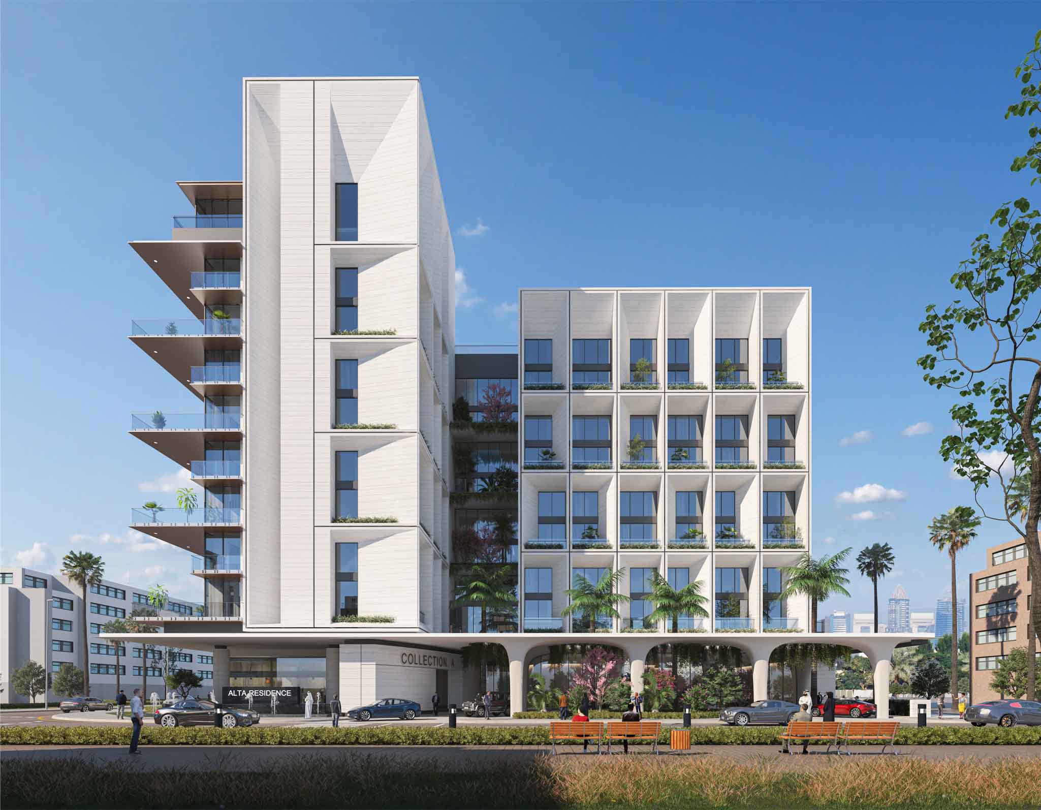The 8-storey mixed-use building in Satwa, Dubai, features a glass and textured stone façade integrated with trees and planters. At its core, a "green-lung" atrium serves as the design's main element, bringing natural light deep into each floor and acting as a vertical garden. The building promotes strong connections to nature with green spaces, including a rooftop garden and planters integrated into the canopy at the drop-off area. This biophilic design enhances air circulation and creates a breathable, harmonious environment, connecting spaces through materiality, spirituality, and visual appeal.