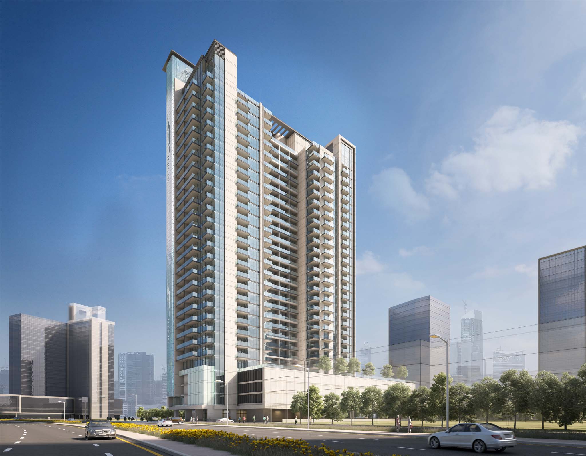 This modern high-rise residential building features a striking architectural design with a sleek glass facade, providing a contemporary urban aesthetic. It consists of 2B+G+P3+26 with total GFA of 33,626.88 SQ.M. The building's design includes spacious balconies and large windows, offering both aesthetic appeal and ample natural light. Situated in an urban landscape, it is surrounded by other high-rise structures and greenery, with easy access via the adjacent main road.